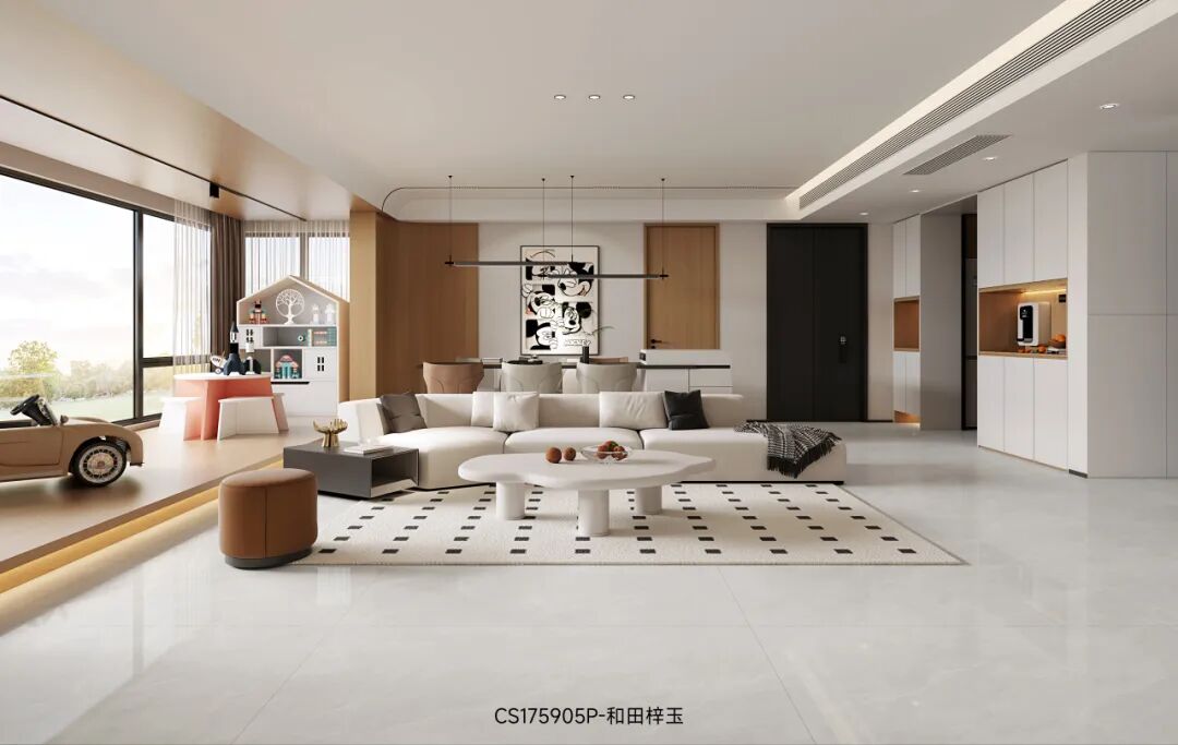 以超白岩板坯为基,色调和谐,肌理细腻,通过精巧的子母砖搭配,赋予空间丰富层次,适配多样风格。